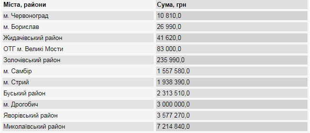 Відповідно до нього, кошти пішли таким районам Львівщини: Буському, Жидачівському, Золочівському, Миколаївському, Яворівському та об’єднаній громаді м. Великі Мости. Тоді також найбільше отримав Миколаївський район – 8,4 млн грн. Також виплати пішли на такі міста: Борислав, Дрогобич, Самбір, Стрий та Червоноград. З них найбільше віддали Стрию – 1,9 млн грн.