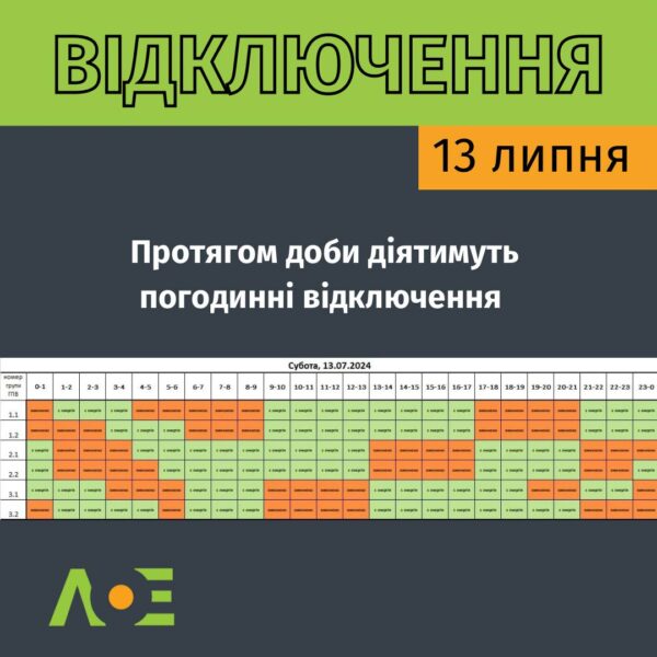 У Львові та області за розпорядженням НЕК “Укренерго” збільшився обсяг відключень на сьогодні (13 липня), починаючи з 14:00 діятимуть три черги. Інформація сформована станом на 12:00. З оновленим графіком на добу можна ознайомитися на світлині.