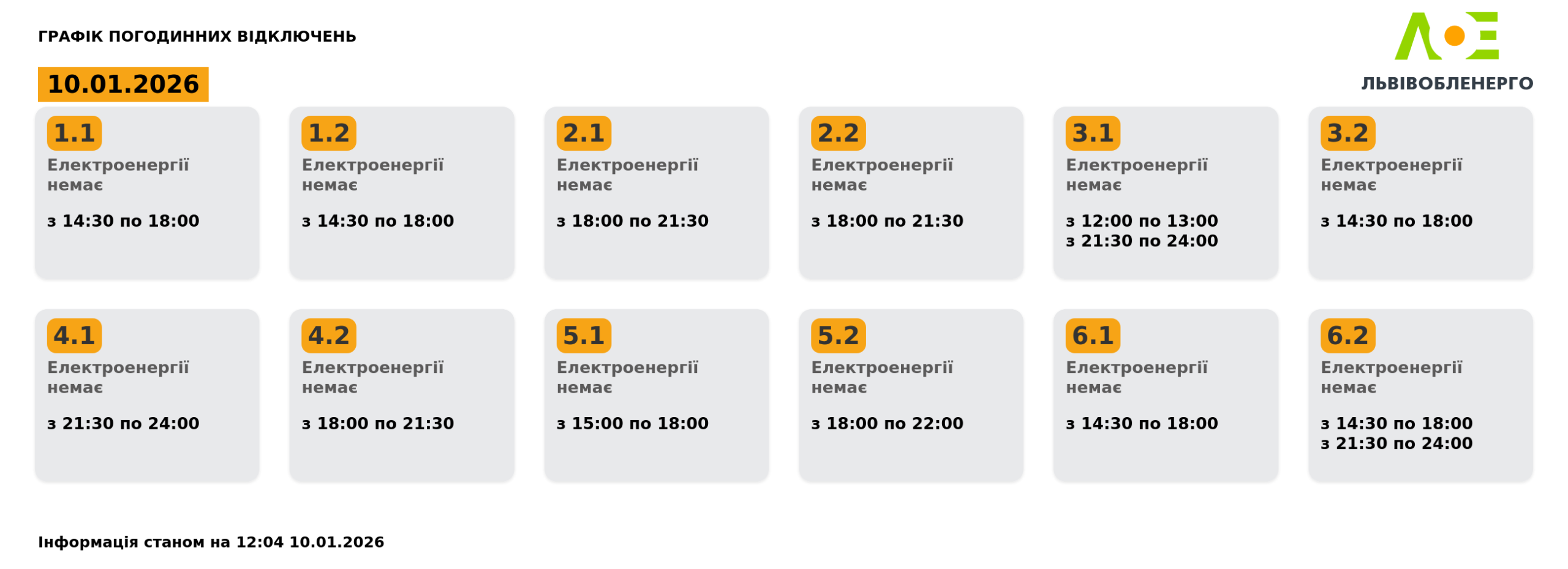 У “Львівобленерго” додали, що термін включення під час планових (погодинних) вимкнень може збільшуватись на час до однієї години, зважаючи на необхідність доїзду оперативних бригад до енергооб’єктів для проведення перемикань. Адже на багатьох енергооб’єктах відключення і включення працівники виконують вручну. Ситуація ускладнюється через затори, особливо у години пік.