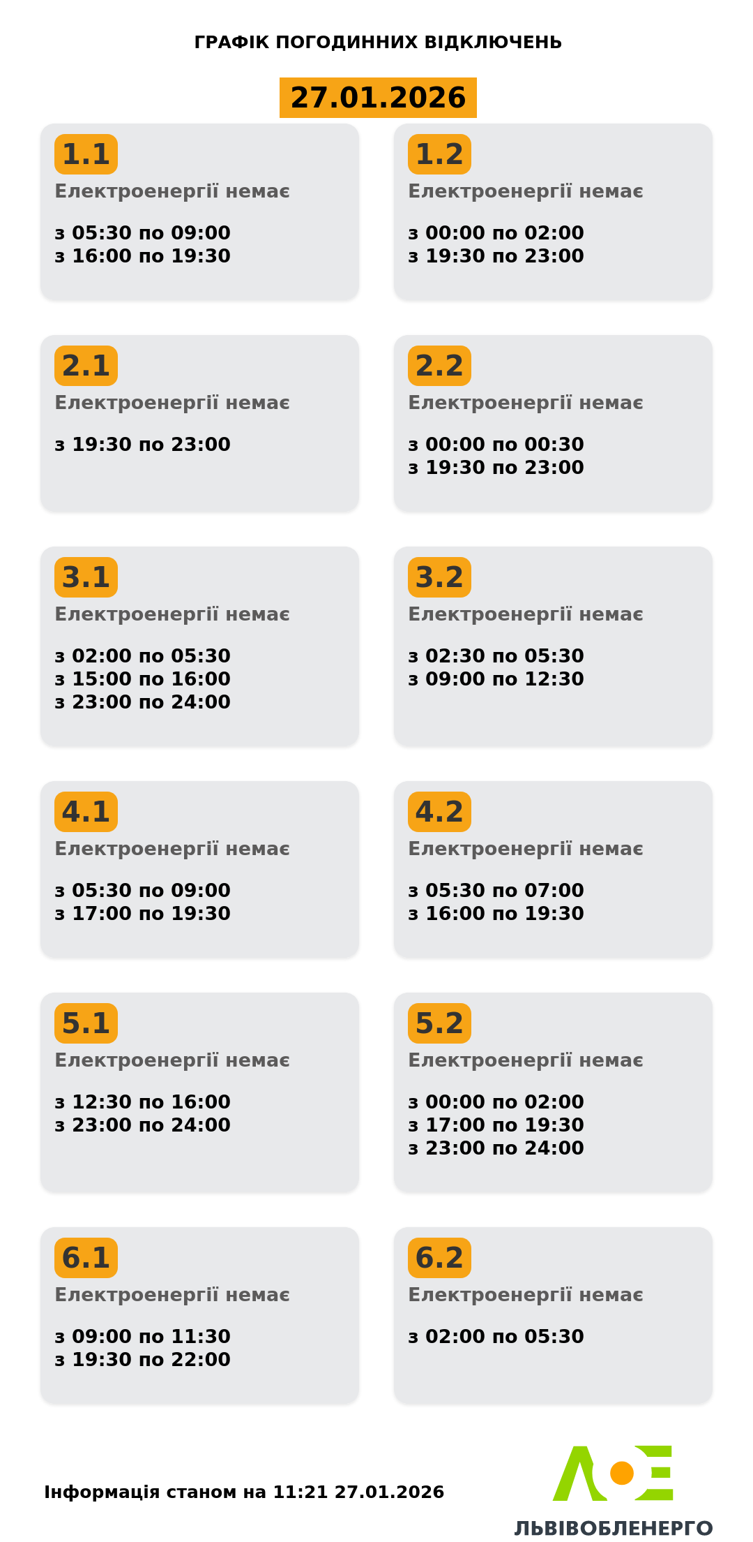 Актуальні графіки відключення світла на Львівщині 27 січня (ОНОВЛЕНО)