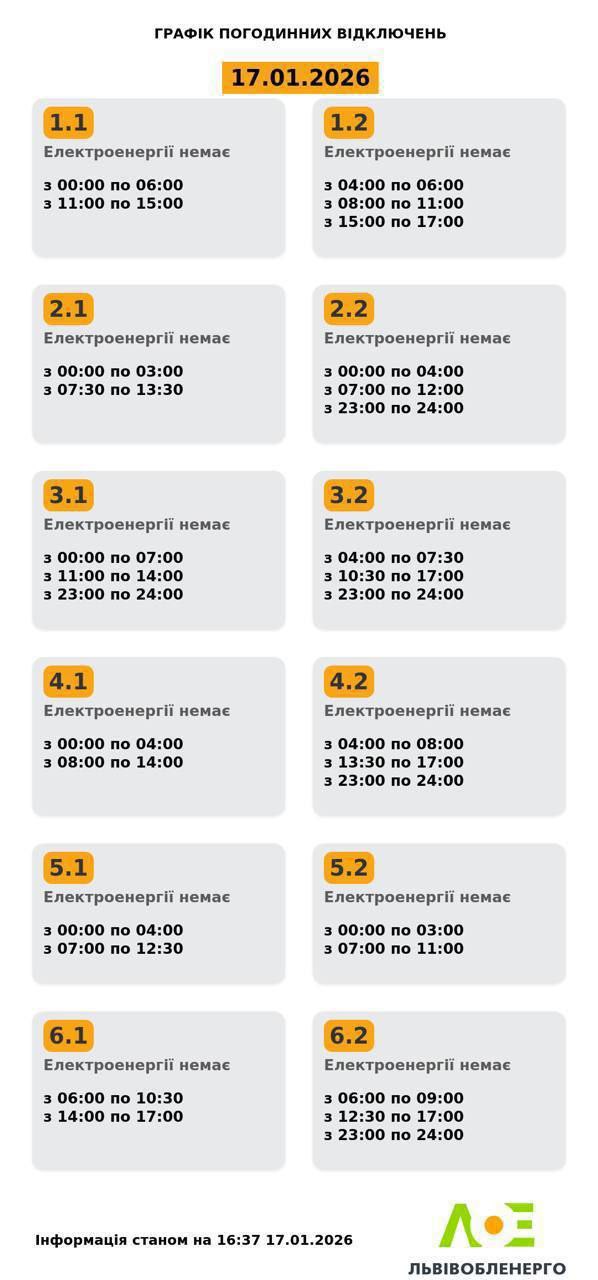 АТ «Львівобленерго» оновило графік погодинних вимкнень електроенергії на суботу, 17 січня. Електропостачання буде обмежене відповідно до груп споживачів.