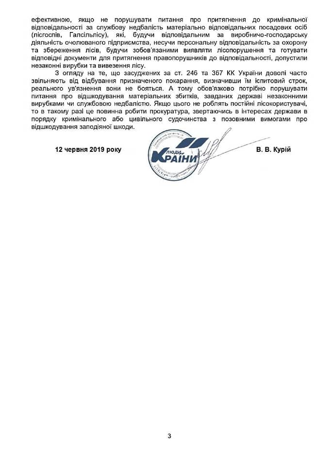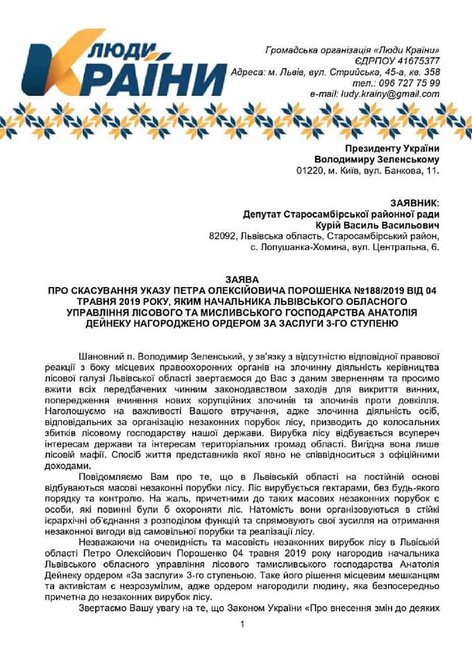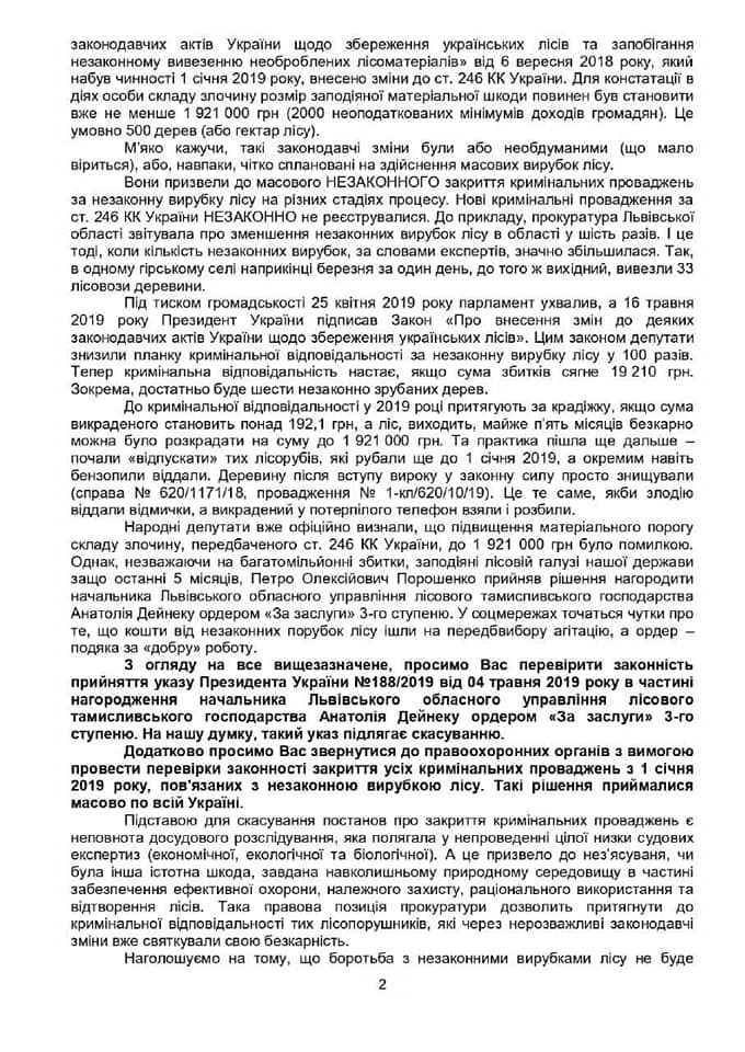 «4 травня ця людина отримала орден за заслуги 3-го ступеню. Увесь абсурд у тому, що ситуація із лісами Львівщини навіть не плачевна, а вже давно глибоко злочинна. Говорю про це давно і постійно. Проте така нагорода є просто плювком в очі всім активістам, котрі боронять карпатські ліси, намагаючись врятувати хоча би те, що є. Оскільки покарати винних у масових рубках, які відбувались досі поки що не вдалося. Пане президенте Зеленський, щиро сподіваюся, що у вас вистачить відваги. Якщо задекларована вами позиція «ламати систему» та «прийде весна, саджати будемо» є не пустослів’ям, то почніть хоча би із такої простої, але важливої справи. Бо ми, активісти, не зупинимось», – написав активіст у facebook.