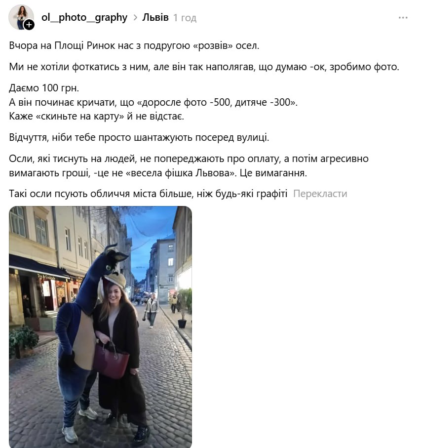 “Ми з подружкою гуляли, побачили цього осла в костюмі і він почав нас просити сфотографуватися. Казав: «будь ласка, зі мною ніхто не фотографується». Почав нас обіймати, переконувати, що це безкоштовно. Ми спочатку відмовлялися, казали, що не хочемо, але врешті зробили фото. Потім подружка дістала 100 гривень, щоб віддячити, і от тоді в нього раптово почалася дуже агресивна реакція. Він почав кричати: «Ви що, за кого мене маєте? 100 гривень?! У мене дитяче фото коштує 300, доросле -500!» Ми пояснили, що більше не маємо, але він почав вимагати, щоб ми переказали на картку. Ми сказали, що не маємо навіть картки з собою – він далі продовжував вимагати гроші. Ми просто втекли від нього”, – поділилася пані Олена.