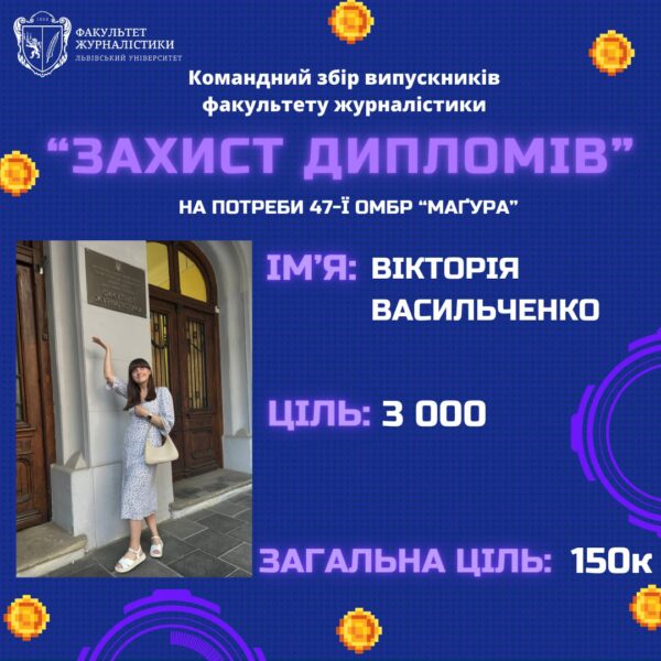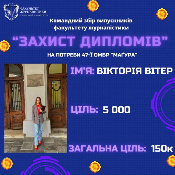 Журналістки LMN Вікторія Васильченко та Вікторія Вітер долучились до збору випускників факультету журналістики Львівського національного університету імені Івана Франка із назвою «ЗАХИСТ Дипломів». Зокрема дівчата відкрили дружні банки, де кожен охочий зможе задонатити кошти на потреби 47-ї ОМБР Маґура, де наразі служить випускник факультету Владислав Данко.