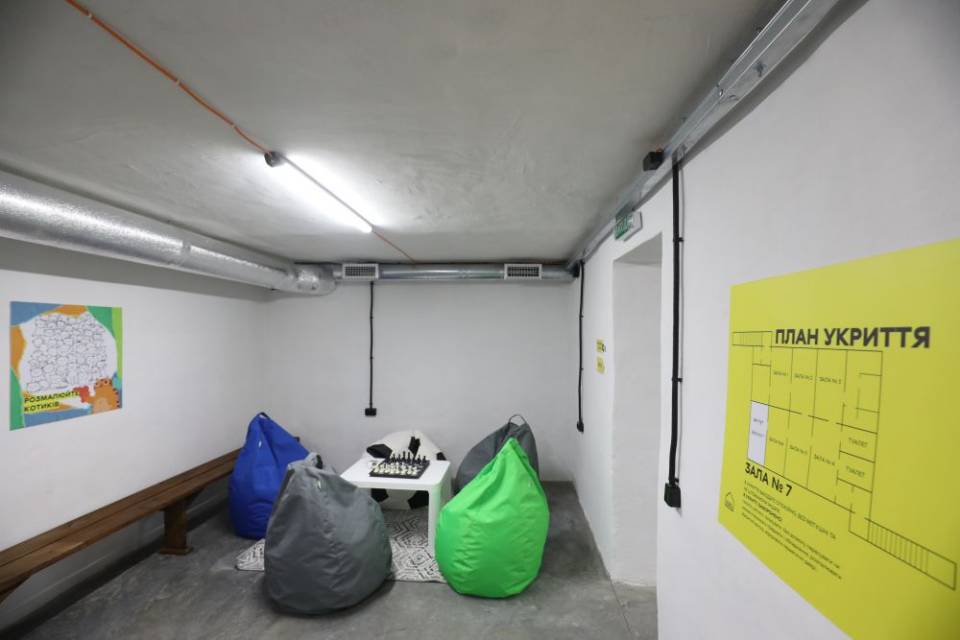 Усередині облаштували вентиляцію з функцією підігріву, провели воду та каналізацію, освітлення, встановили систему опалення. В укритті тепер є чотири туалети, запаси води (2000 літрів), Wi-Fi, кнопка виклику поліції та навіть окремий куточок для дітей. На входах — система автоматичного відкриття дверей під час повітряної тривоги.