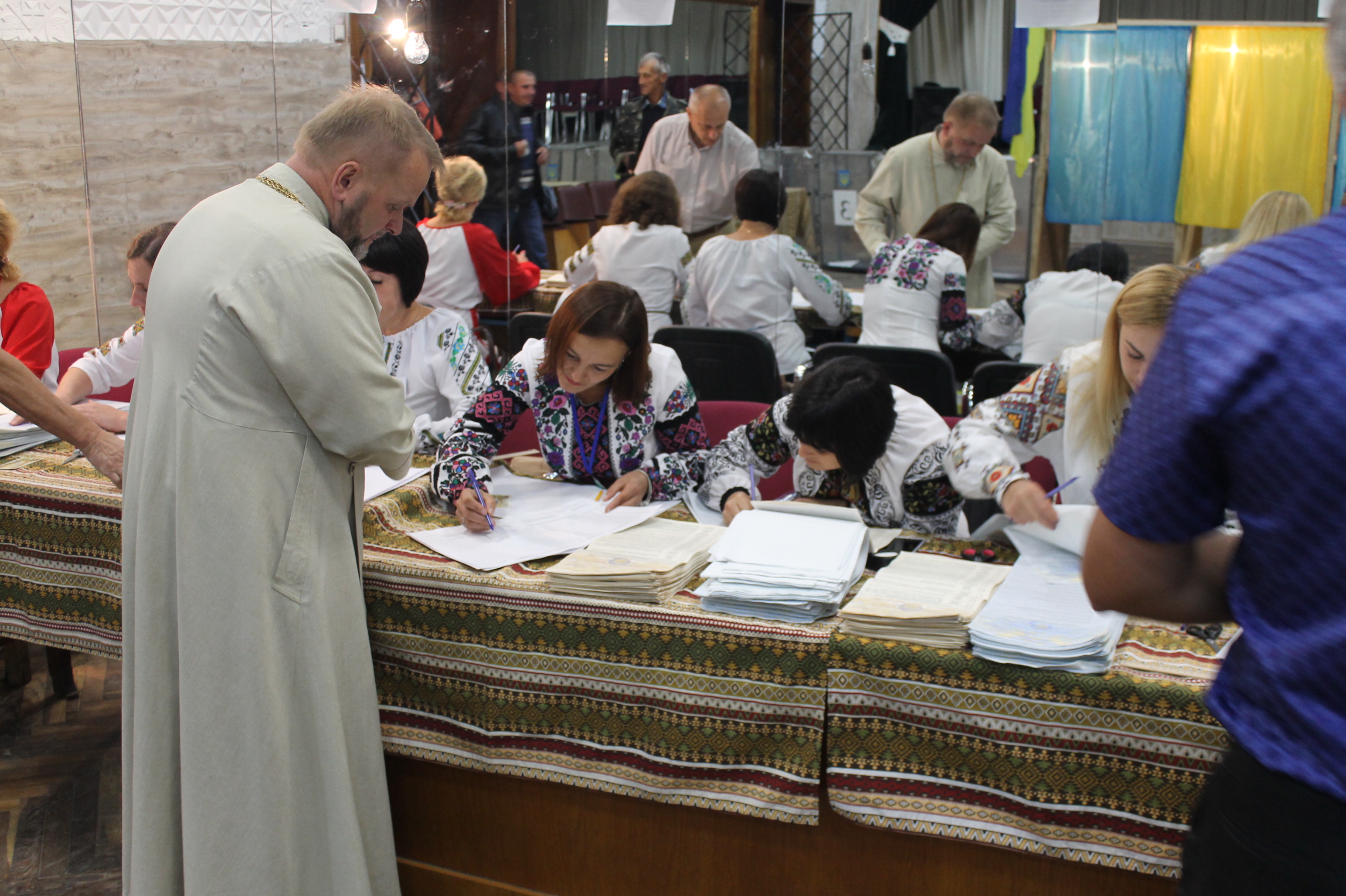“Ходіт сюди, отець Андрій” – каже одна членкиня ДВК і видає служителю церкви 2 бюлетні.