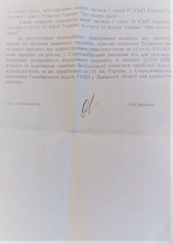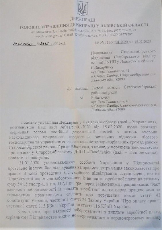 24-го лютого на адресу Старосамбірської районної ради від головного управління Держпраці Львівщини надійшов лист. У ньому йшлося про те, що 31-го січня у комунальному підприємстві Львівської облради “Старосамбірський Галсільліс” комісія виявила порушення законодавства про працю. А саме заборгованість із виплати заробітної плати на загальну суму 541,5 тис. грн, в тому числі 117,1 тис. перед звільненими працівниками.