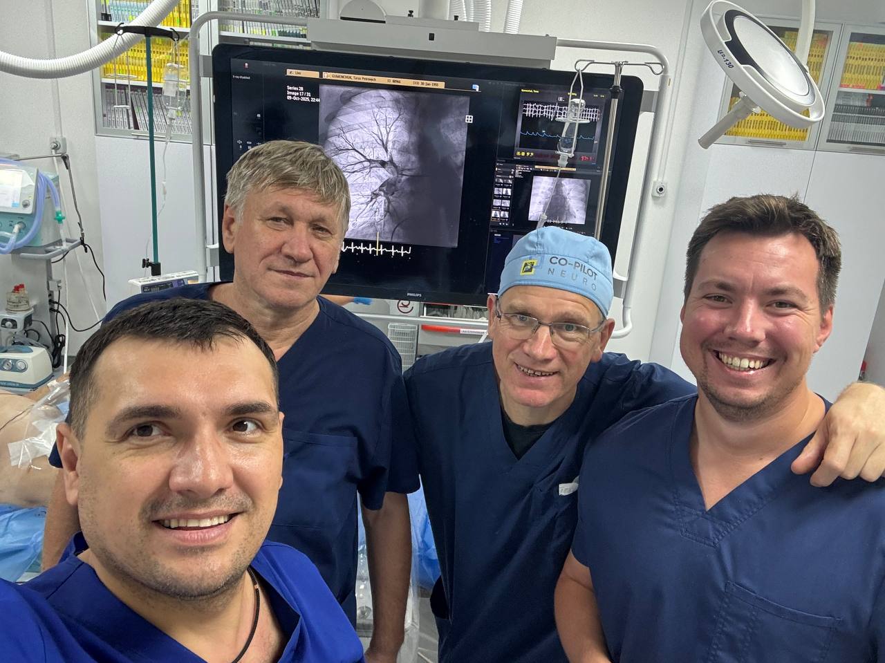Під рентген-контролем фахівці ввели катетер у судину, дісталися до тромбів і успішно видалили їх за допомогою спеціальної аспіраційної системи. При цьому пацієнт був при тямі і спілкувався з лікарями.