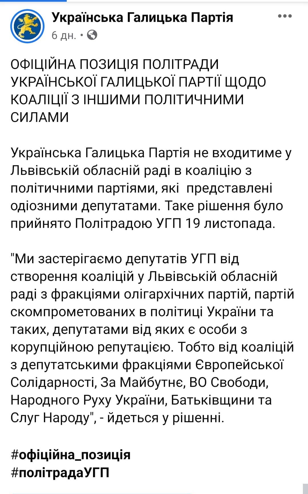 Підставою для такого рішення стало ігнорування з боку новообраних депутатів до обласної ради позиції Політради УГП від 19 листопада про неможливість входження у більшість з олігархічними партіями, які представлені в облраді одіозними депутатами. Тому, Політрада вимагає у Ради Львівської обласної організації відкликати підпис під Меморандумом про співпрацю, який вважає “лиш своєрідним висловленням лояльності до нових “господарів” Львівщини. Також, у Галицькій Партії обурені способом голосування за голову Львівської обласної ради і вважають його “приниженням честі та гідності обранців” та «порушенням принципів таємного голосування», передбаченого Регламентом Львівської облради», – йдеться в заяві.