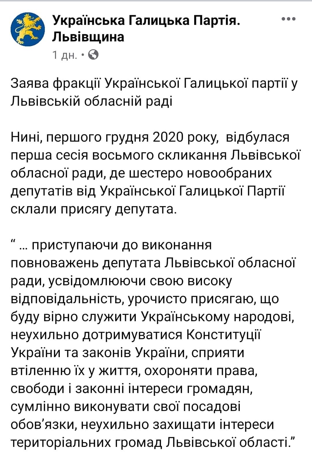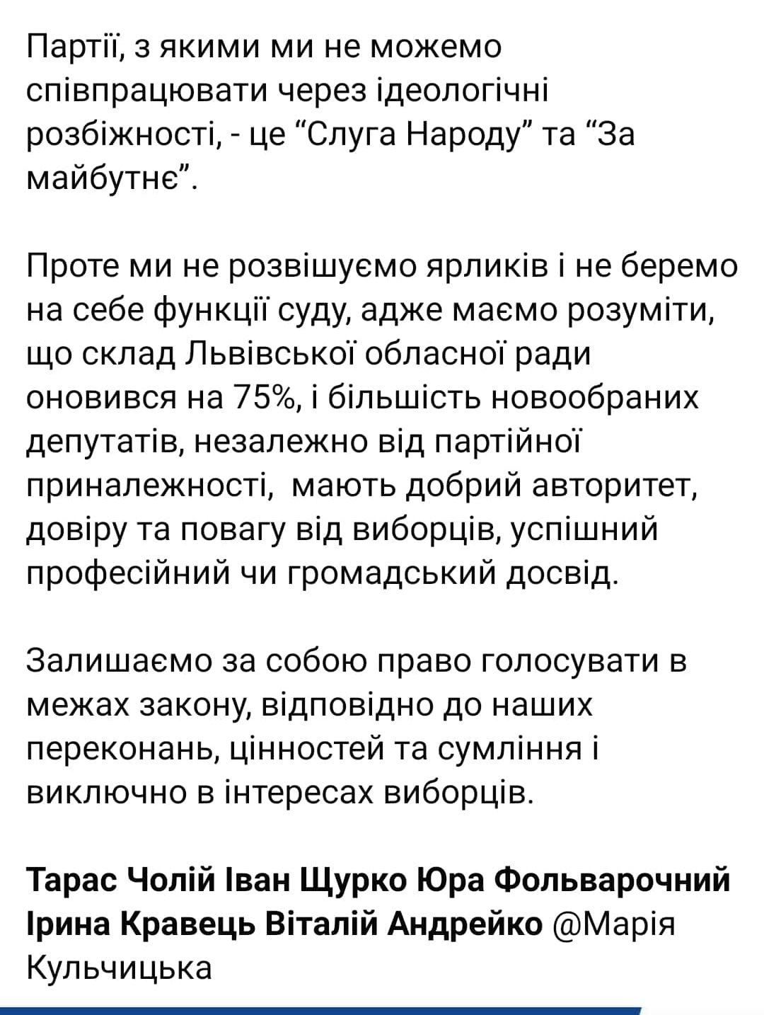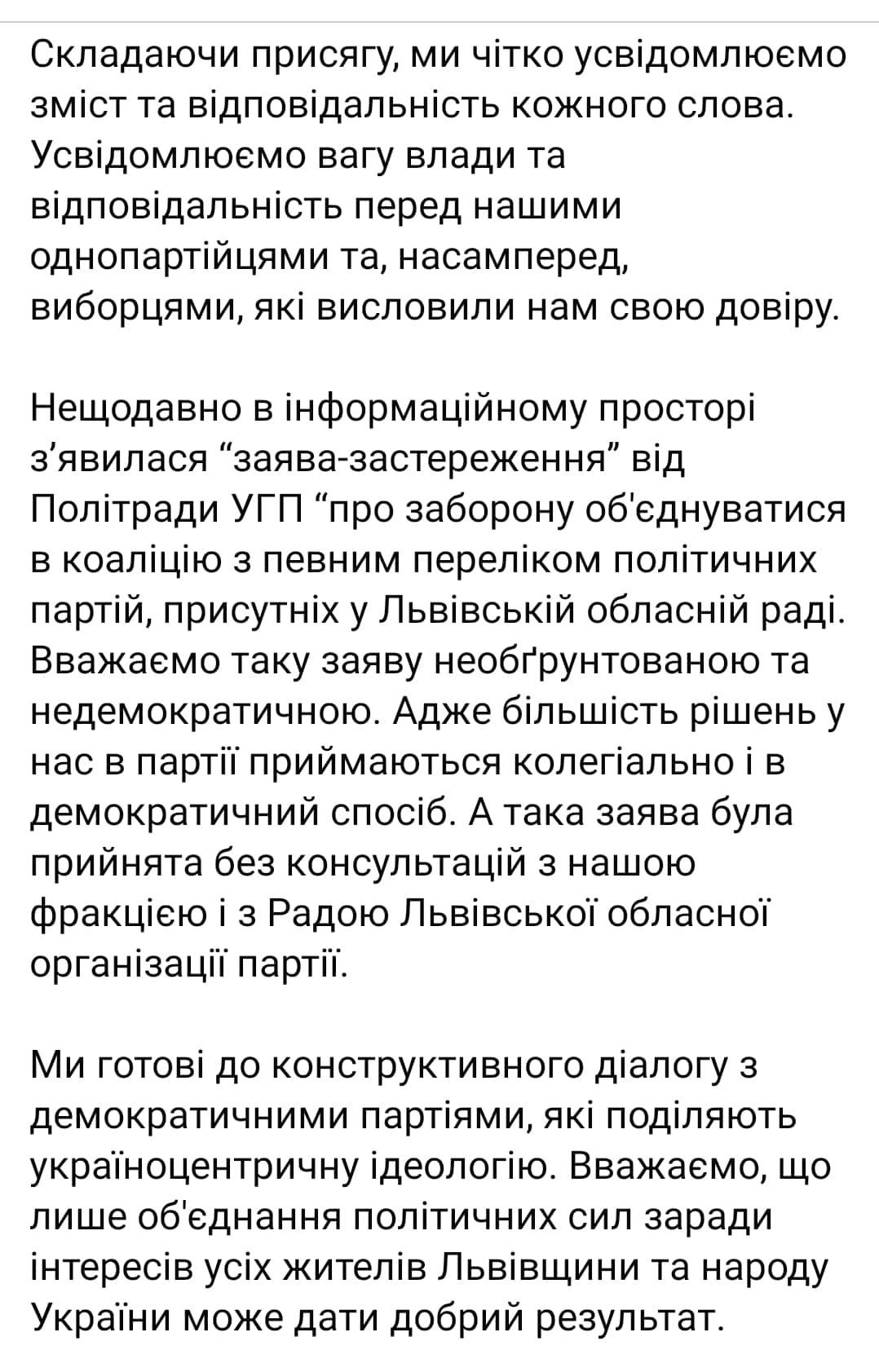 «Головна контрольна комісія Української Галицької Партії прийняла рішення зупинити повноваження голови Львівської обласної організації УГП Тараса Чолія та відсторонити його з посади. А також призупинити членство в партії голови і заступника фракції УГП у Львівській обласній раді Тараса Чолія та Івана Щурка до з’ясування усіх обставин по факту події з підписання Меморандуму в ЛОР 01.12.2020.