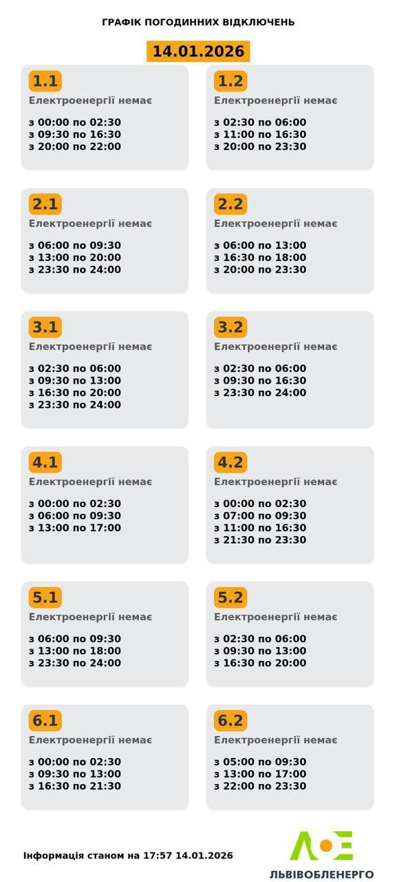 «Львівобленерго» знову оновило графіки відключень світла на середу, 14 січня. Про це повідомили на сторінці компанії.
