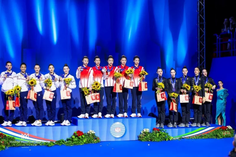 “Національна збірна команда в групових вправах виборола бронзу у фіналі з трьома стрічками і двома м’ячами. Нашу країну представляли спортсменка зі Львівщини Аліна Мельник, а також Марія Височанська, Діана Баєва, Кіра Ширикіна та Валерія Перемета”, – йдеться у повідомленні.