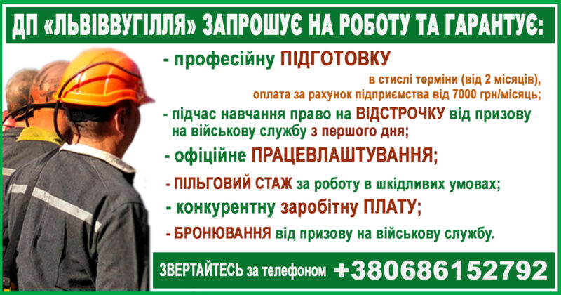 “Робота у ДП«Львіввугілля» — це офіційне працевлаштування, пільговий стаж, бронювання та конкурентна заробітна плата”, – повідомляє директор з кадрів та соціальних питань ДП “Львіввугілля” Юрій Гамала.