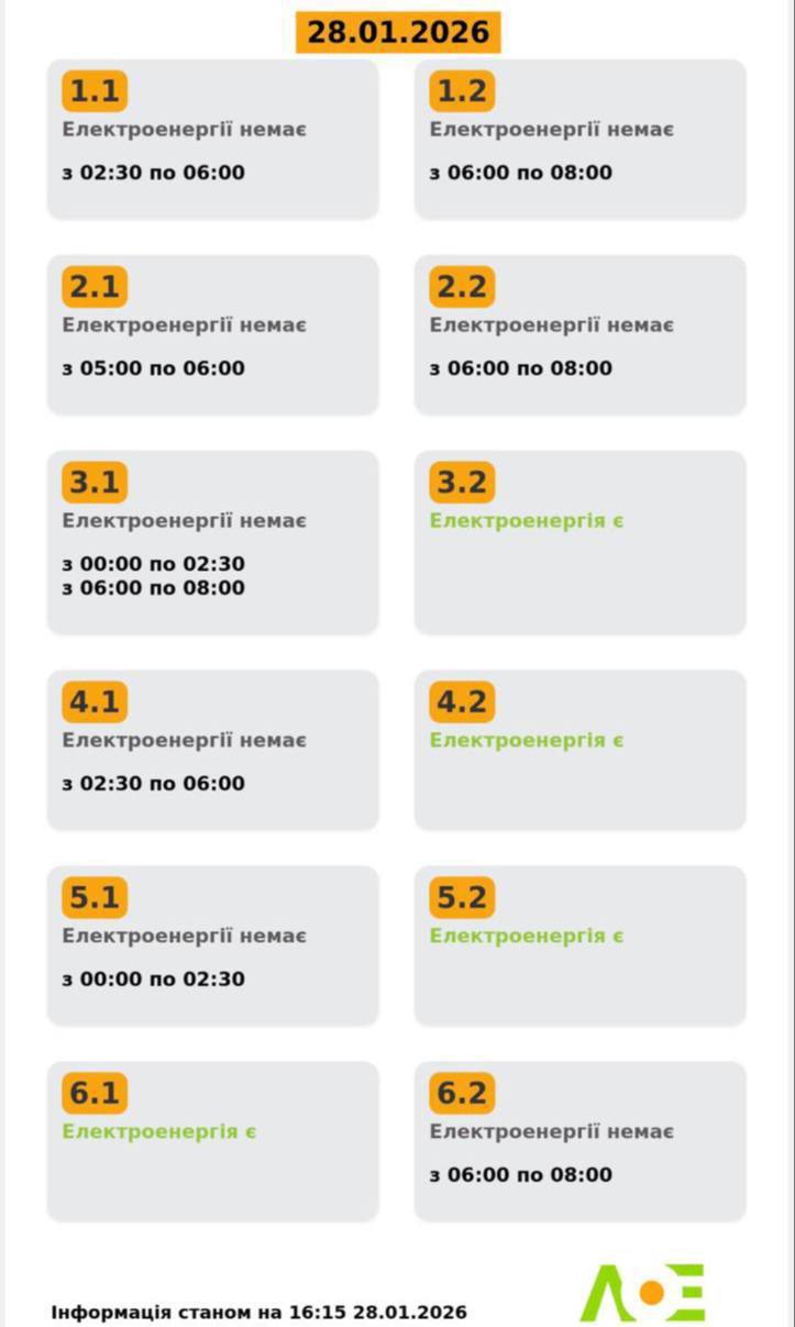 У середу, 28 січня, на Львівщині діятимуть графіки відключення світла. Протягом доби графіки можуть змінитися. Про це повідомили у “Львівобленерго”.