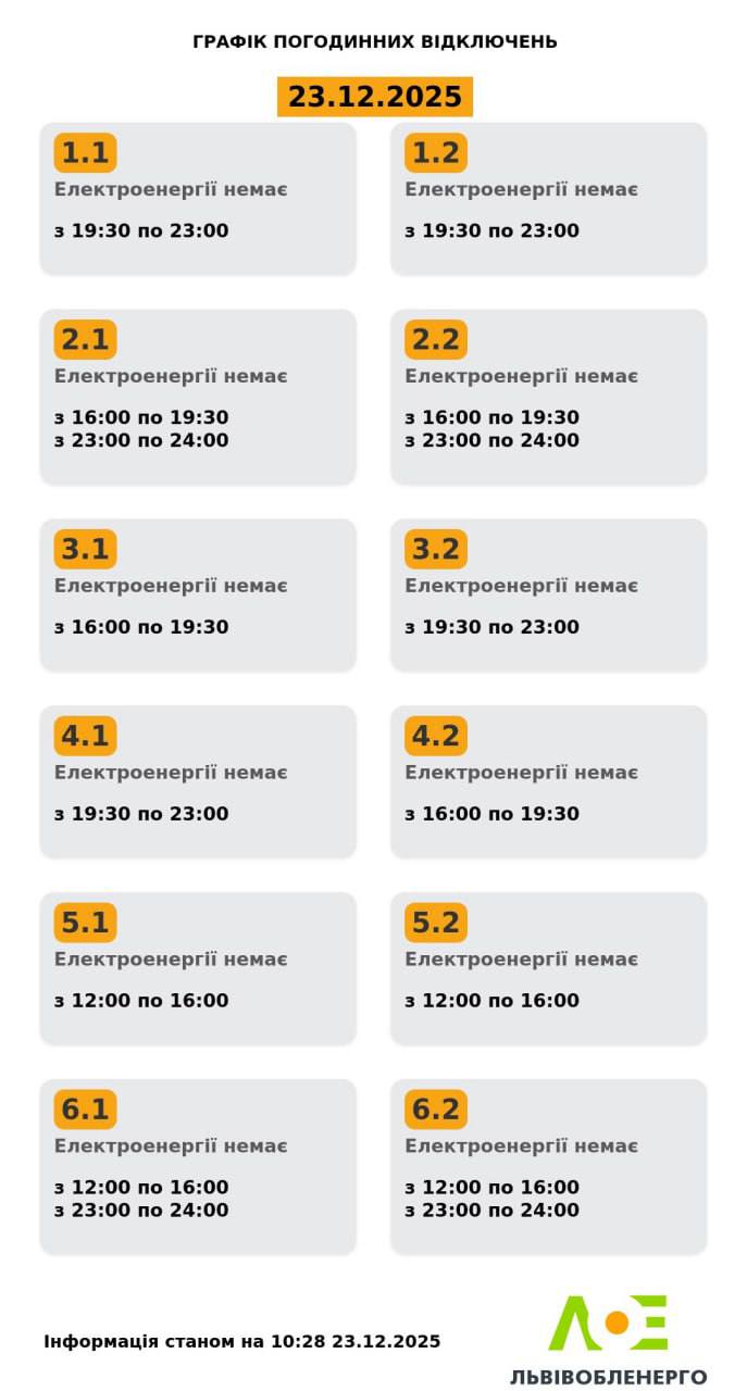 У Львові та області у вівторок, 23 грудня, діятимуть графіки відключень електроенергії. Про це повідомили у “Львівобленерго”.
