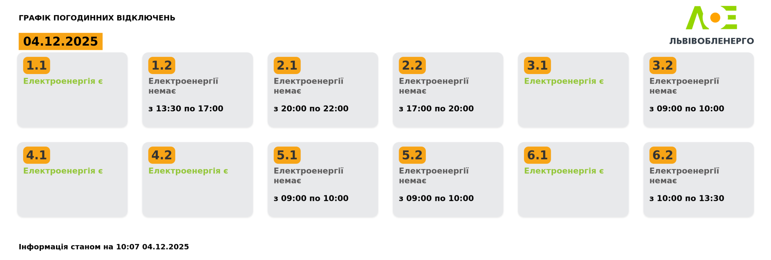 У «Львівобленерго» оприлюднили нові графіки відключення на четвер, 4 грудня. Так, групи 3.1, 4.2 та 6.1 будуть цілий день зі світлом.
