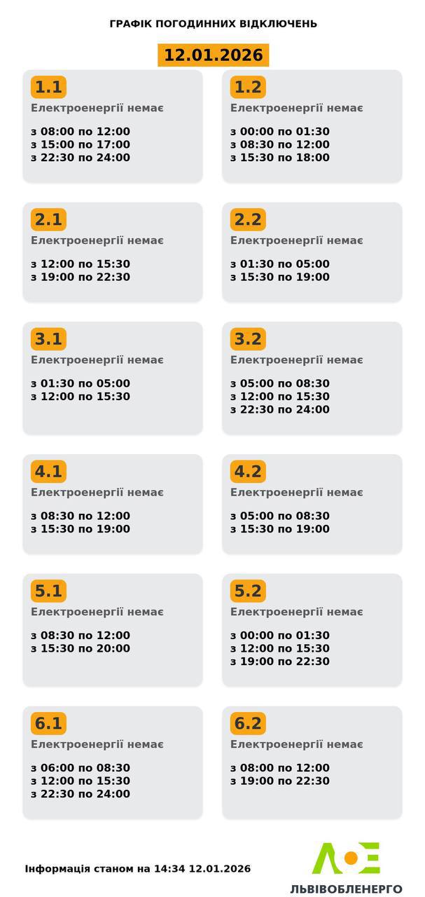 У понеділок, 12 січня, на Львівщині діятимуть графіки відключення світла. Електроенергію вимикатимуть усім групам два або три рази на добу. Впродовж доби графіки можуть змінюватись.