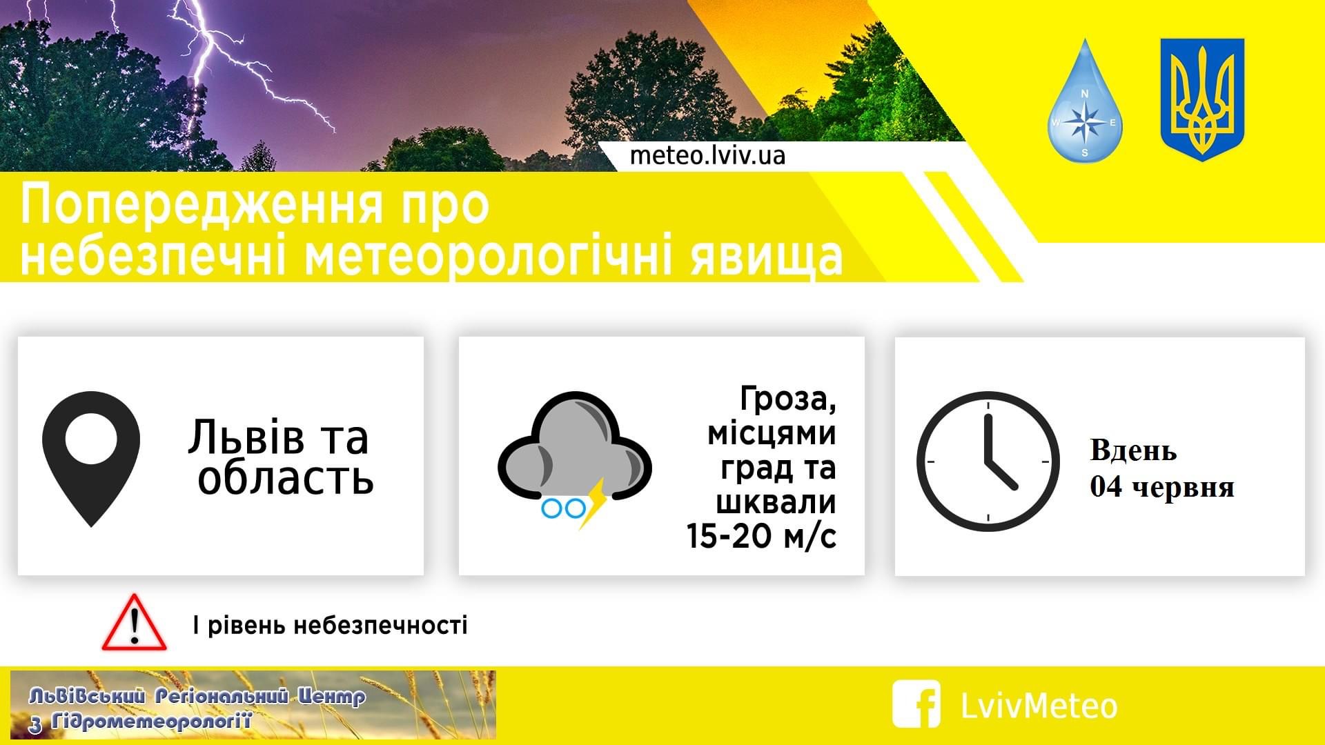 Завтра, 4 червня, вдень у Львові буде гроза, шквали 15 – 20 м/с, град. Про це повідомляє Львівський гідрометцентр.
