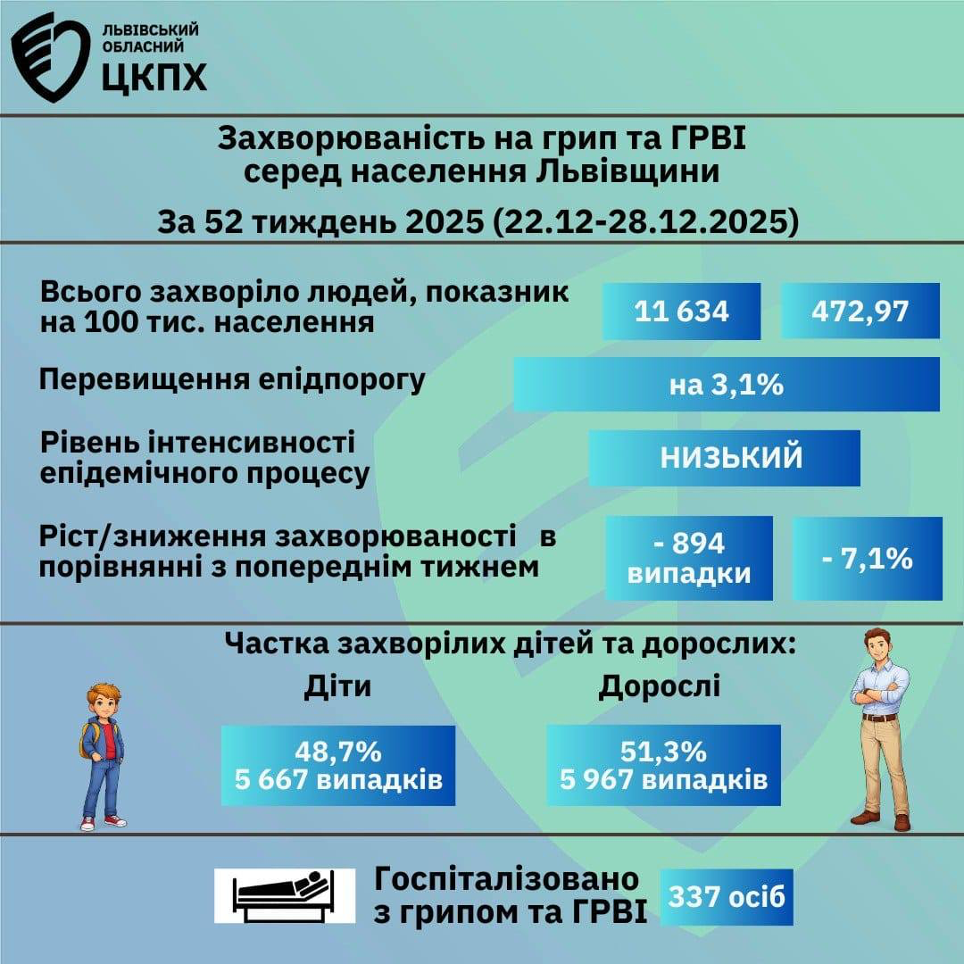 Порівняно з попереднім тижнем рівень захворюваності на Львівщині знизився на 7,1% — це на 894 випадки менше. Водночас із грипом та ГРВІ до медичних закладів госпіталізували 337 пацієнтів.