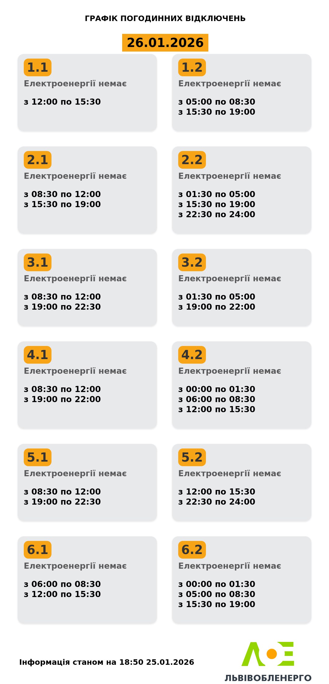 на сайті «Львівобленерго» у розділі «Чому немає світла»: https://poweron.loe.lviv.ua/