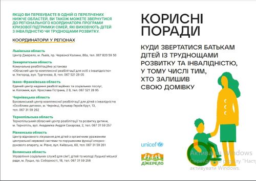 Як розповіли LMN у центрі «Джерело», ця брошура покликана допомогти таким сім’ям організувати надання послуг дітям в громадах західних областей України, і дати відповіді на основні питання, які у них виникають. Наприклад, куди звернутися за консультацією корекційного педагога або як записатися до лікаря на новому місці. У посібнику батьки дітей з труднощами розвитку або інвалідністю можуть дізнатися, як потрапити на навчання в інклюзивний клас/групу чи де отримати колісне крісло або слуховий апарат для дитини.