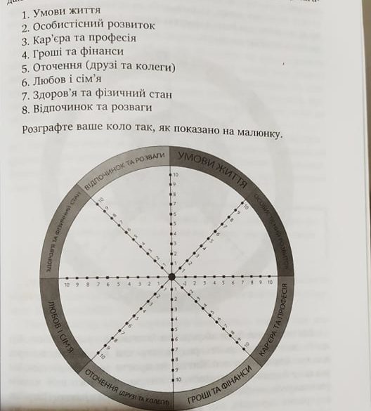 – Можна карту так і залишити, але є ще одне цікаве заняття. На зворотній стороні можна намалювати «Колесо Життя». Для цього малюємо лінії так, щоб зображення нагадало нам сніжинку (приклад показано нижче на фото, – LMN). Таким чином утворюється 8 сегментів – це 8 сфер нашого життя: особистісний розвиток, кар’єра та професія, гроші та фінанси,оточення, любов та сім’я, здоров’я та фізичний стан, відпочинок та розваги, умови життя. Кожну з цих сфер потрібно оцінити від 0 до 10 у вашому житті. Пізніше, з’єднавши ці оцінки, виходить певна фігура. Якщо вона не зовсім рівна, має перекоси – ви самі зрозумієте, над якими сферами потрібно реально попрацювати.