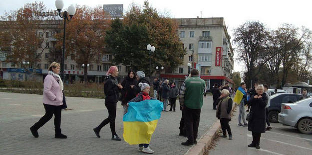 На фото можна побачити людей з українською символікою на центральній площі Свободи, де навесні були мітинги проти російської окупації.