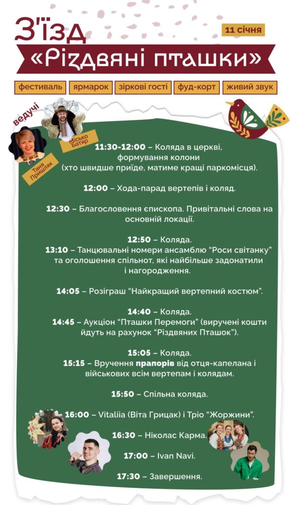 В програмі заходу – хода-парад вертепів і коляд, спільна коляда, розіграш «Найкращий вертепний костюм», аукціон, вручення прапорів всім учасникам, виступи популярних виконавців (Ivan NAVI, Ніколас Карма, тріо «Жоржини» і Vitaliia.