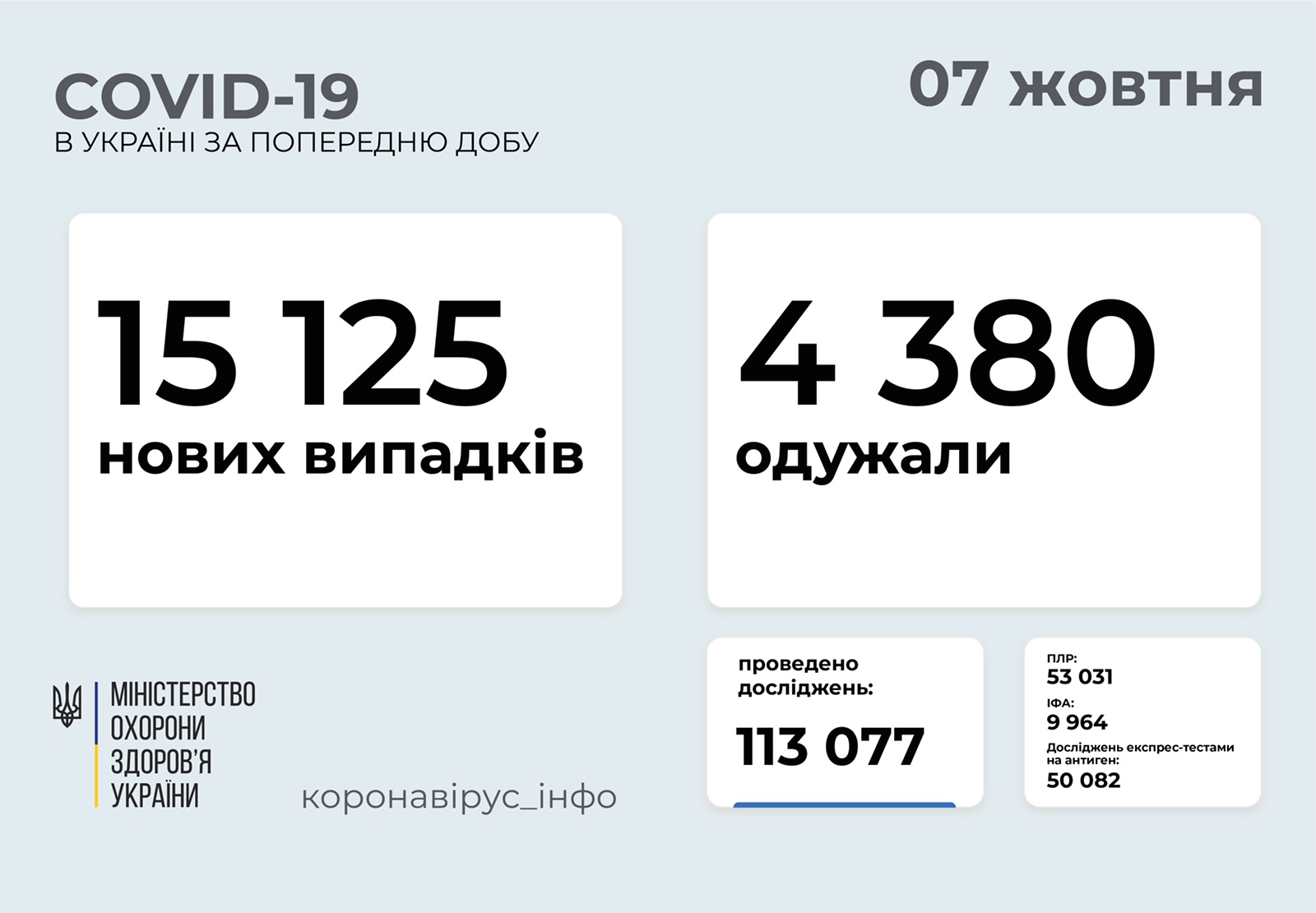 6 жовтня в Україні зафіксували 15 125 випадків захворювання на Covid-19. 314 українців від нього померли. 3 541 особу госпіталізували з коронавірусною хворобою чи підозрою на неї. Одужали 4 380 пацієнтів, повідомило Міністерство охорони здоров’я.