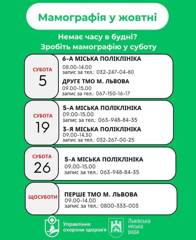 Для зручності львівʼянок та мешканок громади, зробити мамографію у Львові, вже традиційно, можна у вихідний день – суботу. Як повідомили у міській раді, із собою потрібно мати електронне скерування від сімейного лікаря, а також попередньо записатись за телефоном обраного медзакладу.