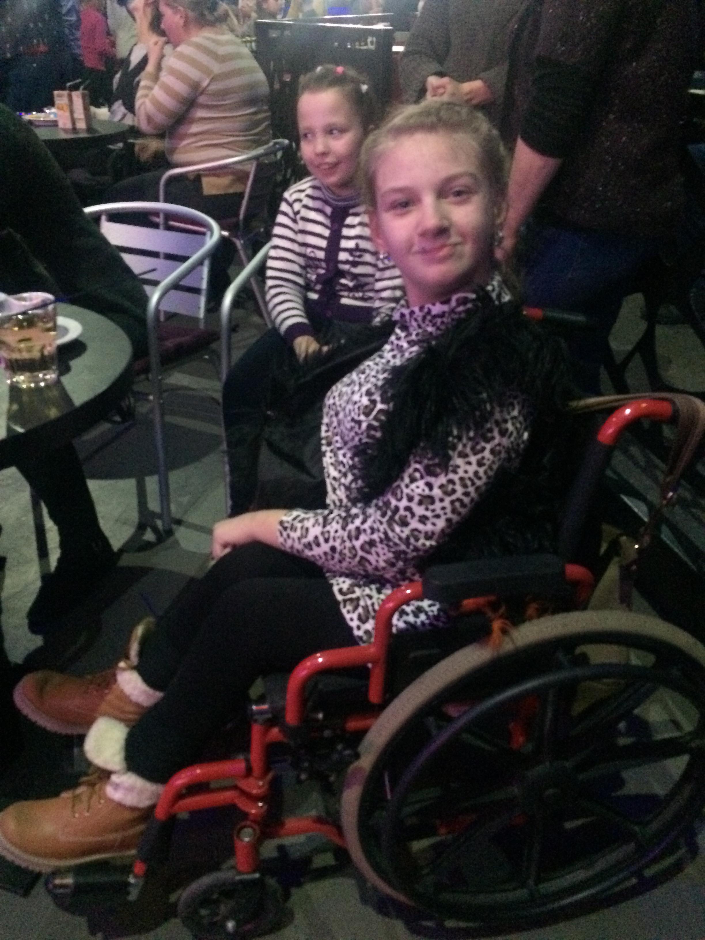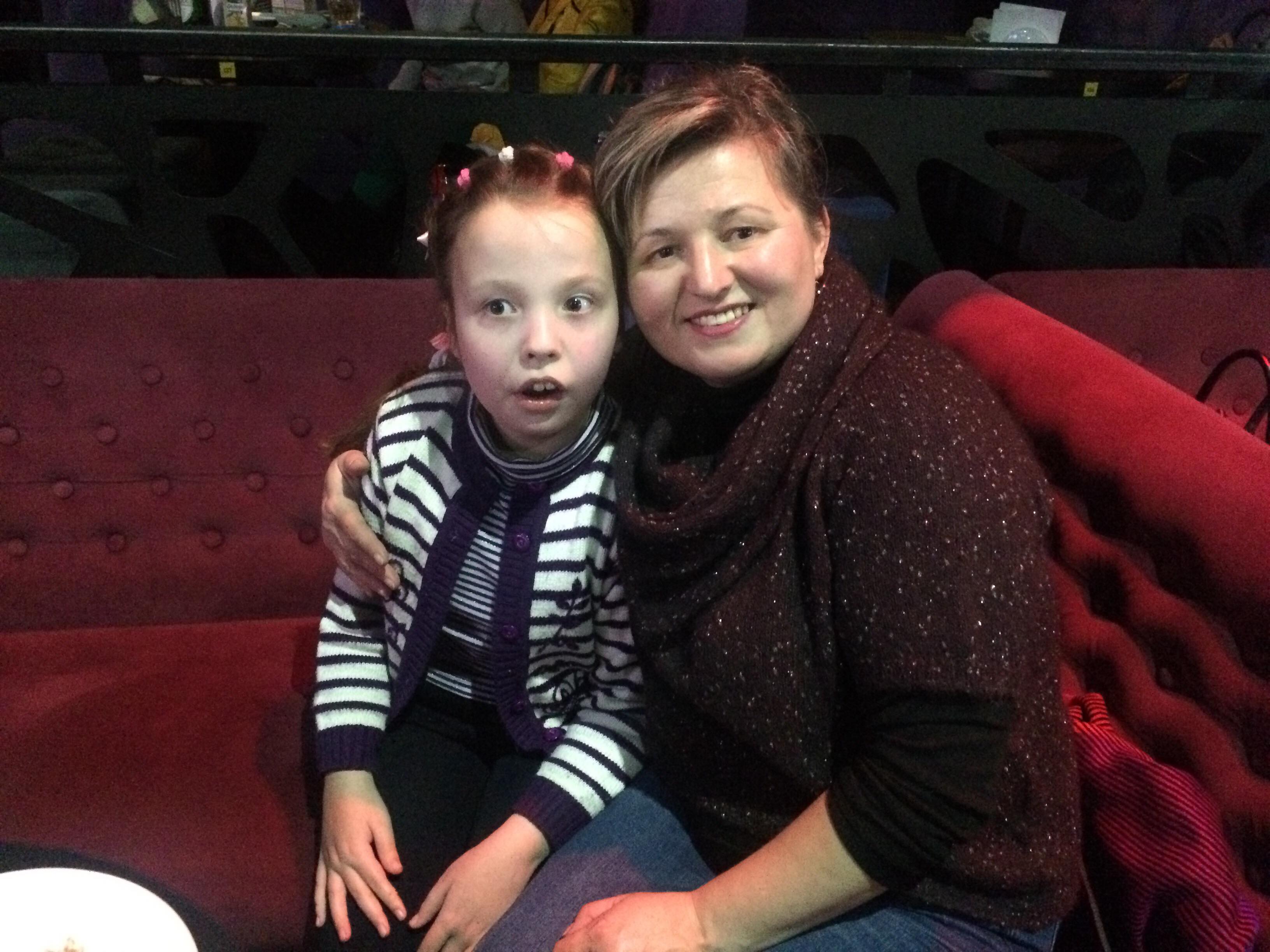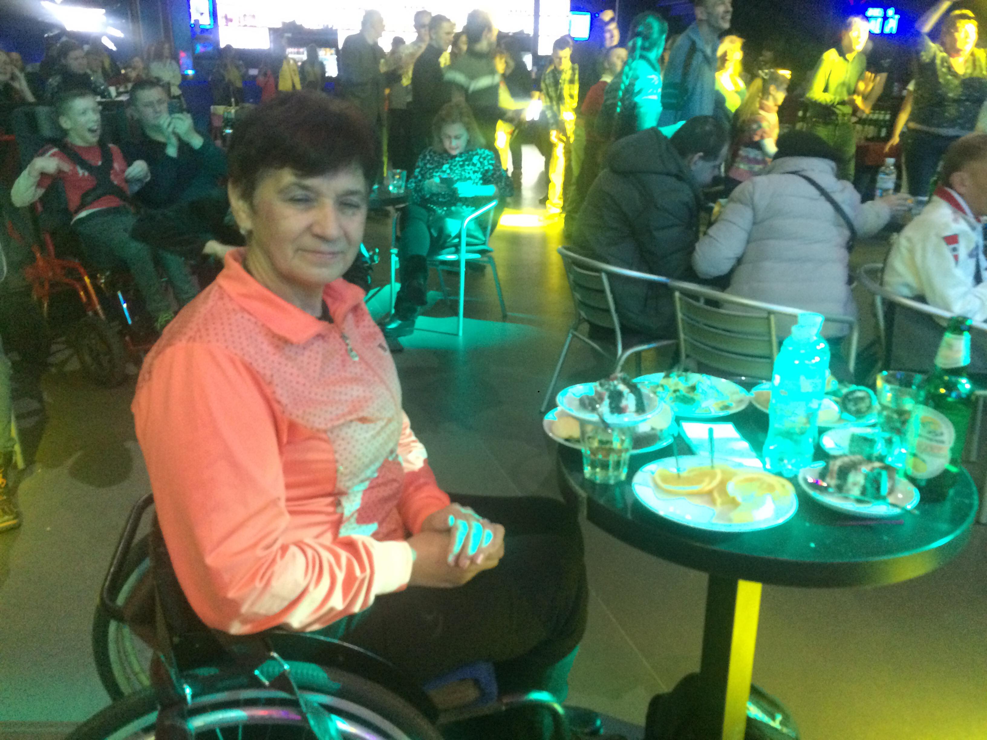 До одного з столів під’їжджає на візку Анастасія. На вигляд дівчині близько 25 років. Набирає в тарілку солодощів, прямує до подруг, щоб пригостити.