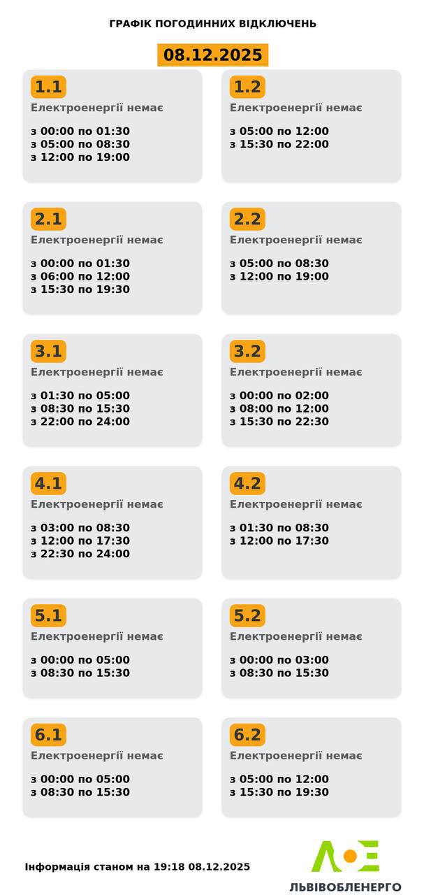 Львівобленерго оновило графік відключення електроенергії на сьогодні, 8 грудня. Відповідний графік зʼявився на сторінці компанії.