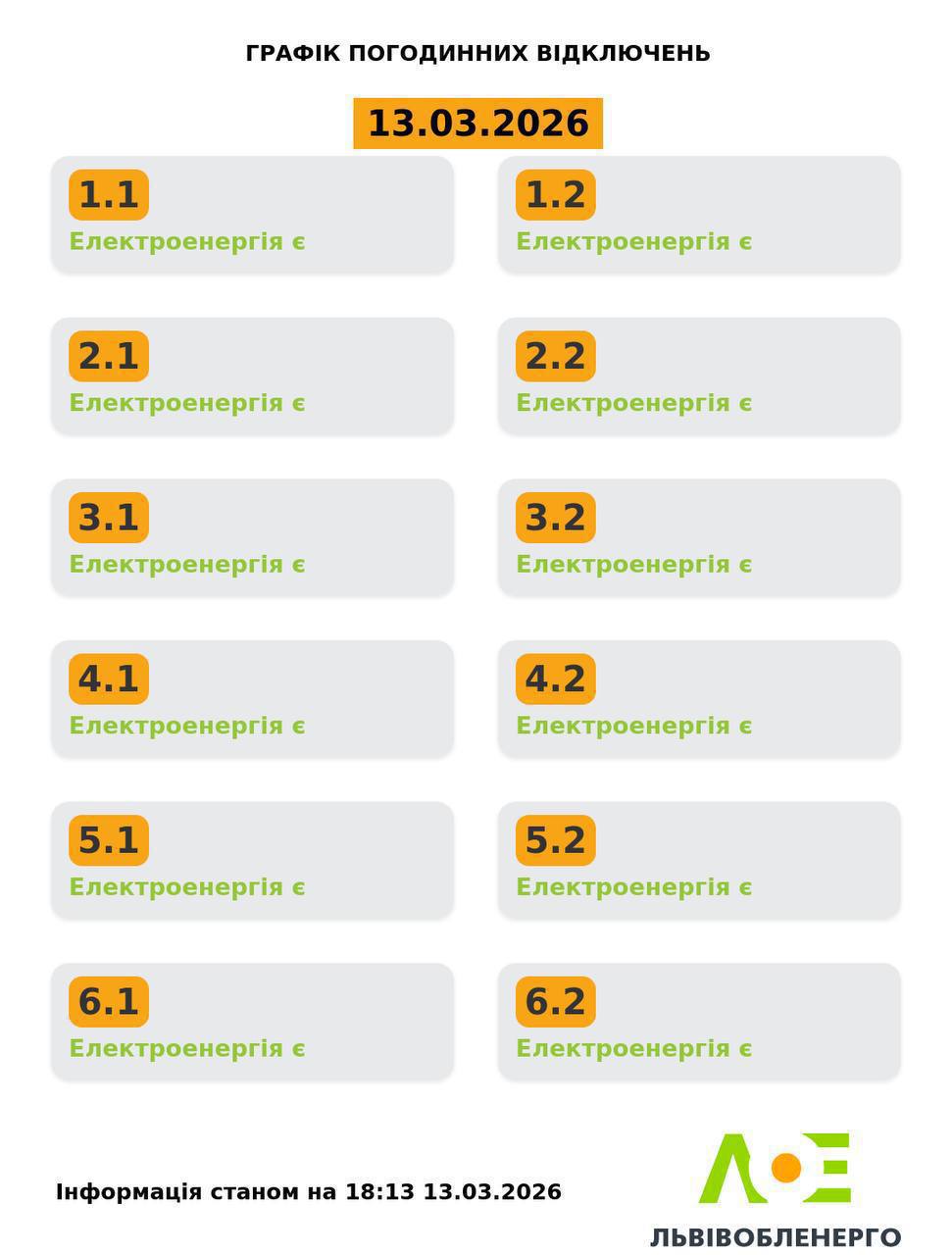 “Львівобленерго” оновило графіки відключення електроенергії на сьогодні, 13 березня. Про це повідомили на сторінці компанії.