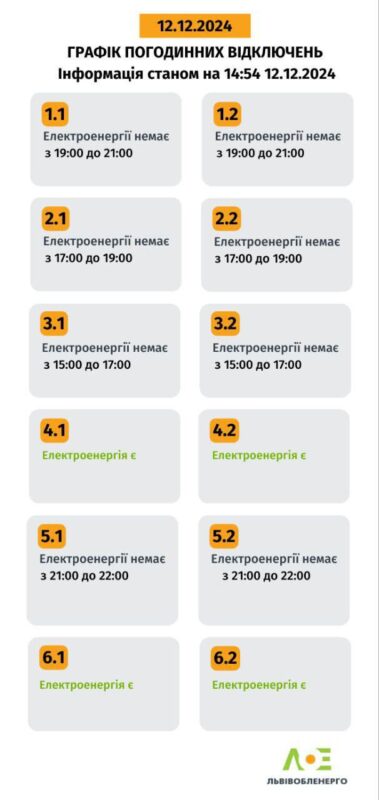 Сьогодні, 12 грудня, ПрАТ «Львівобленерго» змінило кількість підчерг у графіку погодинних відключень – тепер їх 12. Це призвело до збільшення з трьох до шести груп відключень, за якими споживачі відстежують графіки відключення електроенергії. Про це повідомили у пресслужбі.