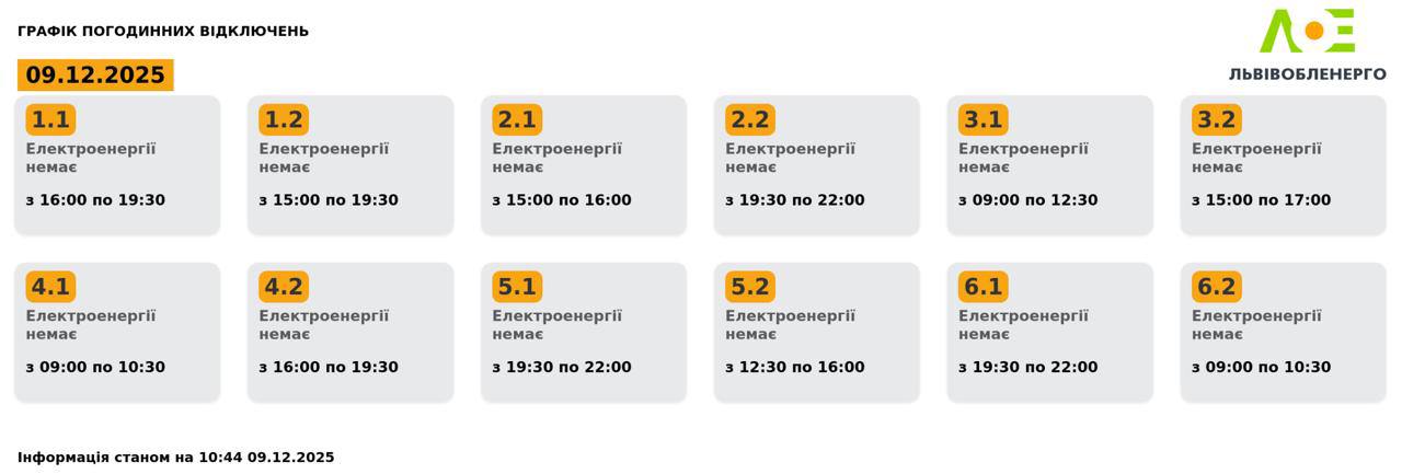 У Львові та області у вівторок, 9 грудня, діятимуть графіки відключень електроенергії. Світло вимикатимуть усім групам. Про це повідомили у «Львівобленерго».