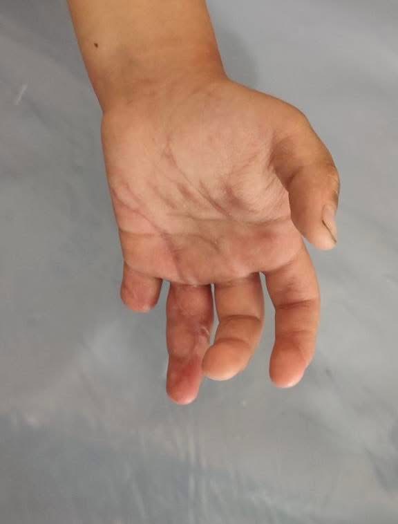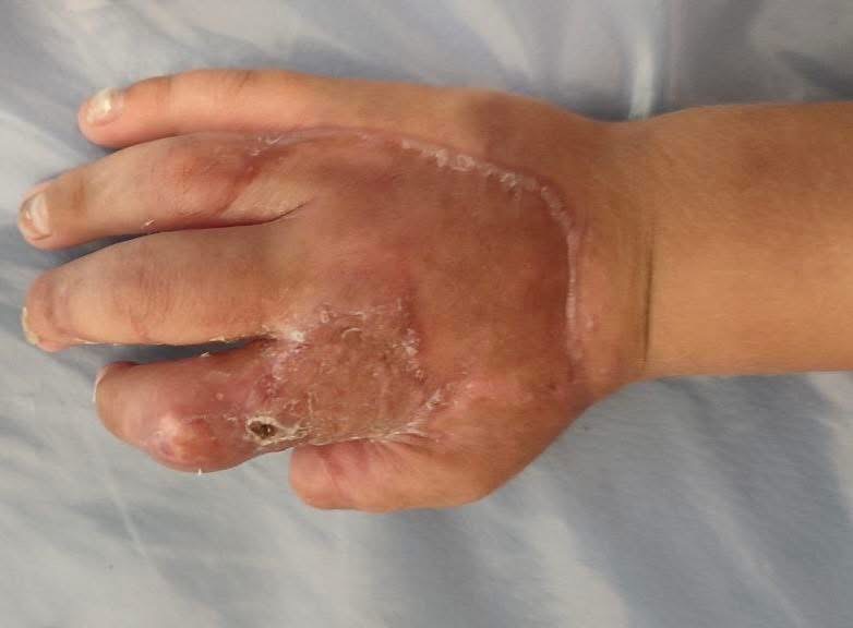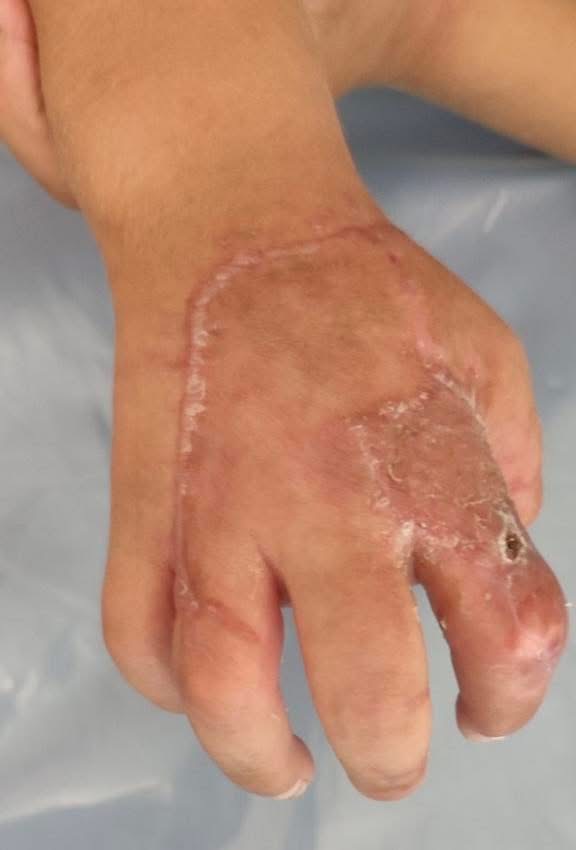 Лікарі діагностували при поступленні: множинні рвано-скальповані рани та дефекти шкіри обох кистей; відкриті переломи 2 пальців на правій руці; відкритий перелом 4-го пальця на лівій;часткова втрата м’яких тканин та частини 2-ох пальців.