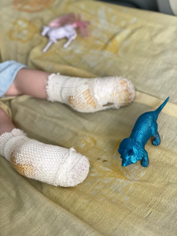 Маленька пацієнтка — Анічка з Одещини. Якось у березні крихітка зайшла в домашню баню з бойлером і відкрила один із кранів — на шлангу з гарячою водою. Під напором той почав «стрибати» і рясно поливати ноги дитини окропом. На плач прибігла мама, схопила донечку і помчала до лікарні. Через надто глибокі опіки дитину екстрено доправили в Одесу. А звідти на 11-й день, через погіршення стану, Анічку скерували у Львів.