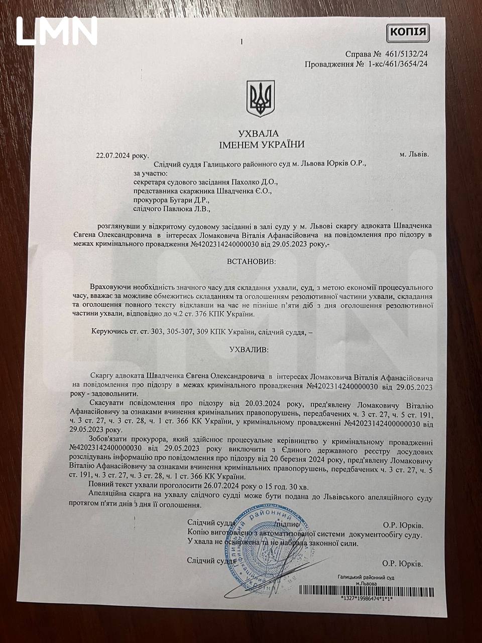 Нагадаємо, у справі про розкрадання бюджетних коштів на реконструкції військового ліцею у Червонограді підозру отримали семеро осіб – радник міністра фінансів, львівський бізнесмен Віталій Ломакович, його партнер по бізнесу Володимир Баб’як, директор дніпровської будівельної фірми «Укрстройкомплект» Єгор Клименко, бухгалтерка Cвітлана Маліцька та начальник відділу цієї фірми Олег Чубченко, а також полковник академії сухопутних військ Юрій Черевко та начальник військового ліцею в Червонограді Іван Сивоус.