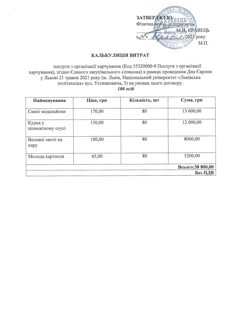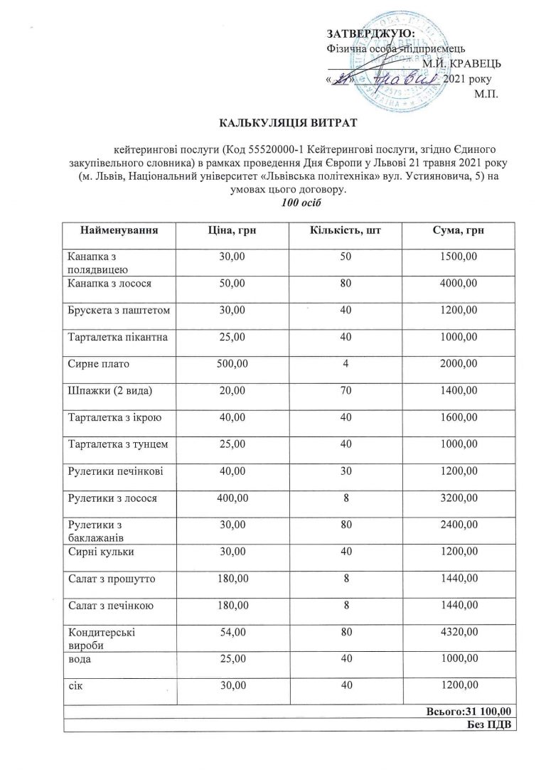 31 100 грн з обласного бюджету спрямували на кейтерингові послуги, 38 800 грн – на послуги з організації харчування. Як випливає з меню, холодні перекуси готувалися для 100 осіб, орієнтовно на кожну особу мало припасти понад 690 грн. Проте, на практиці через обмежену кількість учасників, середні витрати на гостя становили більше 1380 грн.