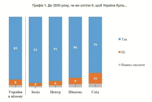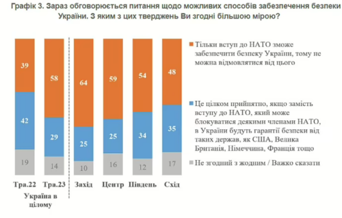 Соціологи зазначають, що у регіональному вимір також бачать консенсусний погляд: від 67% на Сході до 81% на Заході вважають таку поступку неприйнятною для встановлення миру.