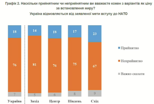 При цьому лише для 18% респондентів прийнятно буде відмовитися від вступу до НАТО заради встановлення миру, а для 76% опитаних така ціна є неприйнятною.