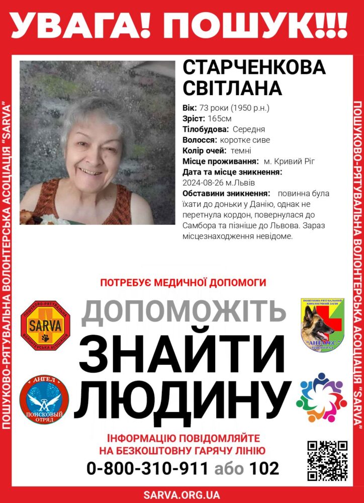 На Львівщині розшукують 73-річну Старченкову Світлану. Як повідомили у волонтервській пошуково-рятувальній організації Sarva, жінка повинна була їхати до доньки у Данію, однак не перетнула кордон та повернулася до Львова, після чого її місцезнаходження невідоме.