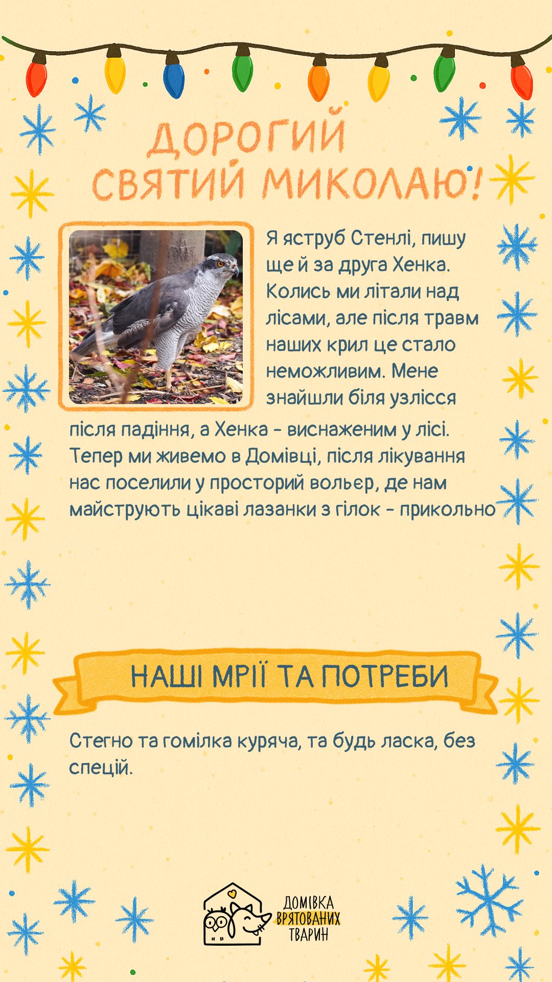 Організатори закликають львів’ян і всіх небайдужих стати для тварин їхнім Миколаєм. Для цього потрібно лише обрати один із «листів бажань» — символічних послань від мешканців Домівки. У кожному з них — прохання про щось потрібне: іграшку, миску, овочі, насіння, ласощі чи навіть ліки.