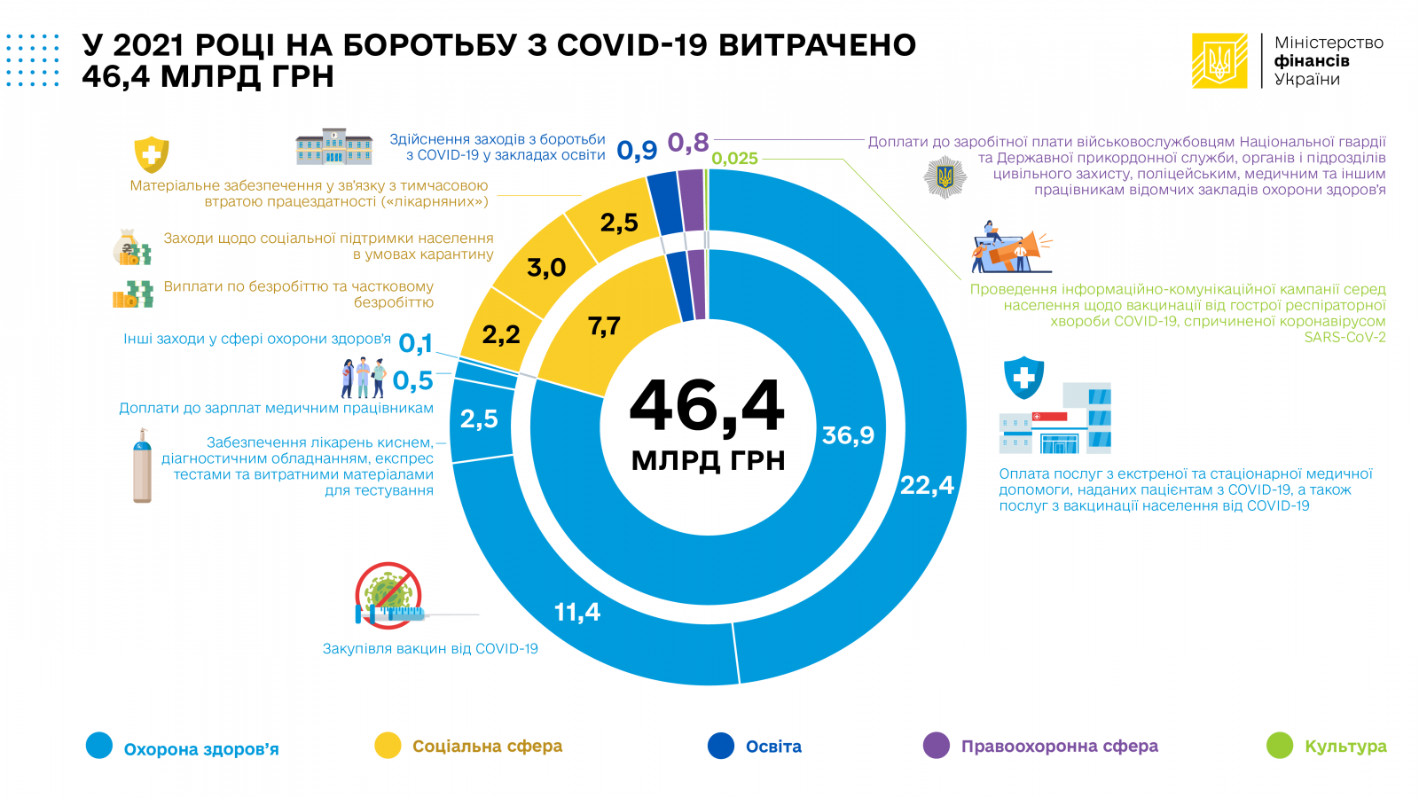 Минулого року на боротьбу з коронавірусом з бюджету України витратили 46,4 млрд гривень. Про це розповідають у Міністерстві фінансів.