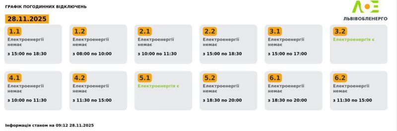 На Львівщині у п’ятницю, 28 листопада, діятимуть графіки відключень електроенергії. Без електроенергії споживачі будуть до протягом дня. Про це повідомили у «Львівобленерго».