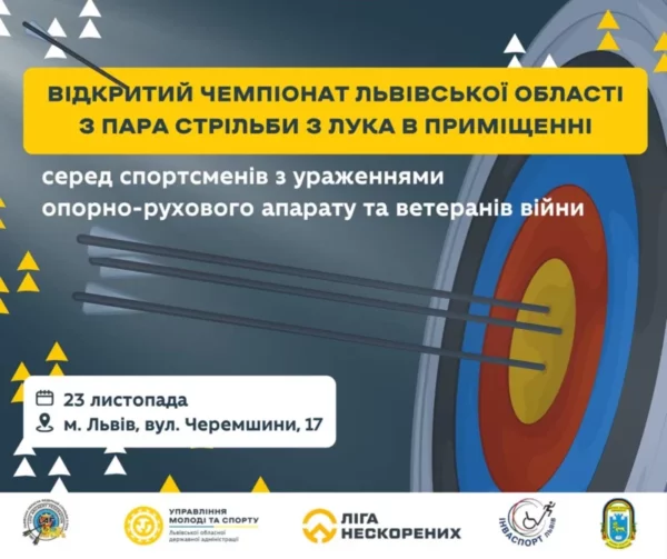 Триває реєстрація на відкритий чемпіонат Львівської області з пара стрільби з лука в приміщенні серед спортсменів з ураженням опорно-рухового апарату та ветеранів війни. Про це повідомилиу Львівській ОВА.