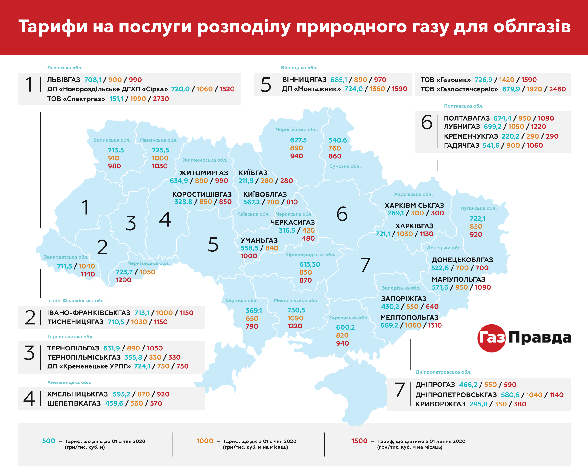 На початку року вартість доставки з липня планували збільшити одразу на 20%. Однак 24 червня Національна комісія, що здійснює державне регулювання у сферах енергетики та комунальних послуг, внесла зміни до свого торішнього рішення, яким встановила нові тарифи на розподіл газу. Через суттєве зниження ціни на цей вид палива, регулятор переглянув розмір підвищення тарифів для низки постачальників. Так, тариф «Львівгазу» з 1 липня становитиме 1,18 грн/м3 з ПДВ, замість передбаченого раніше 1,33 грн/м3.