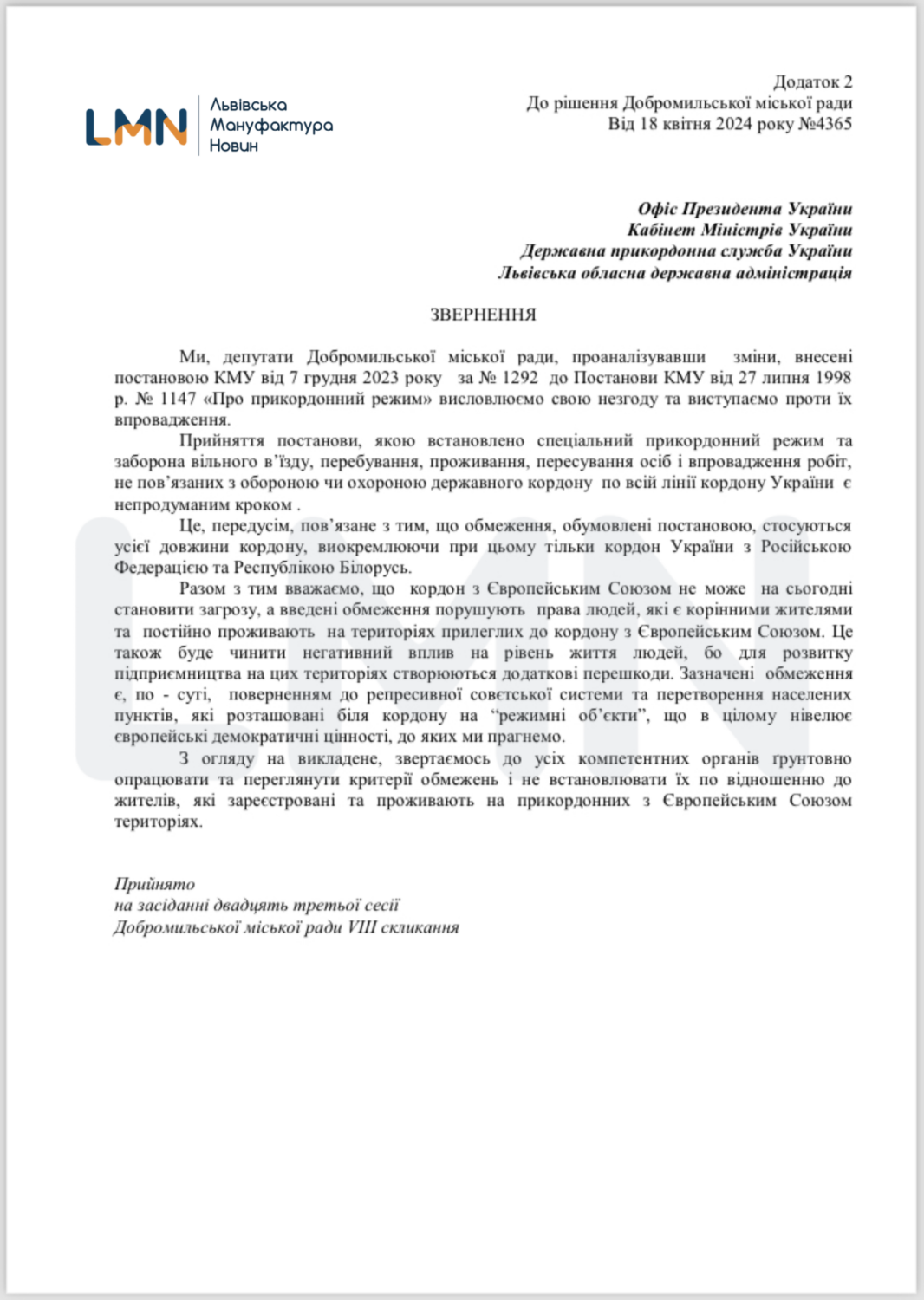 «Прийняття постанови, якою встановлено спеціальний прикордонний режим та заборона вільного в’їзду, перебування, проживання, пересування осіб і впровадження робіт, не пов’язаних з обороною чи охороною державного кордону по всій лінії кордону України є непродуманим кроком. Це, передусім, пов’язане з тим, що обмеження, обумовлені постановою, стосуються усієї довжини кордону, виокремлюючи при цьому тільки кордон України з Російською Федерацією та Республікою Білорусь», – йдеться у зверненні.