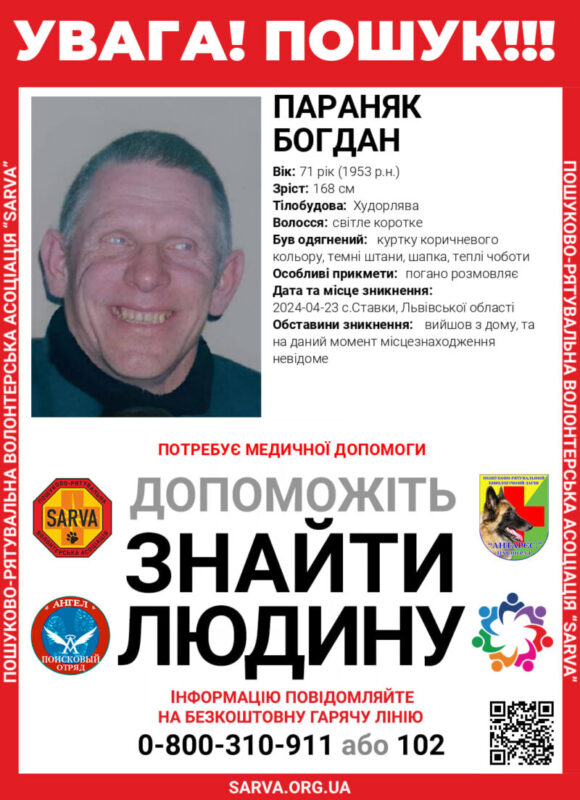 За словами волонтерів, Параняк Богдан 23 квітня вийшов з дому у селі Ставки й на даний момент місцезнаходження невідоме.