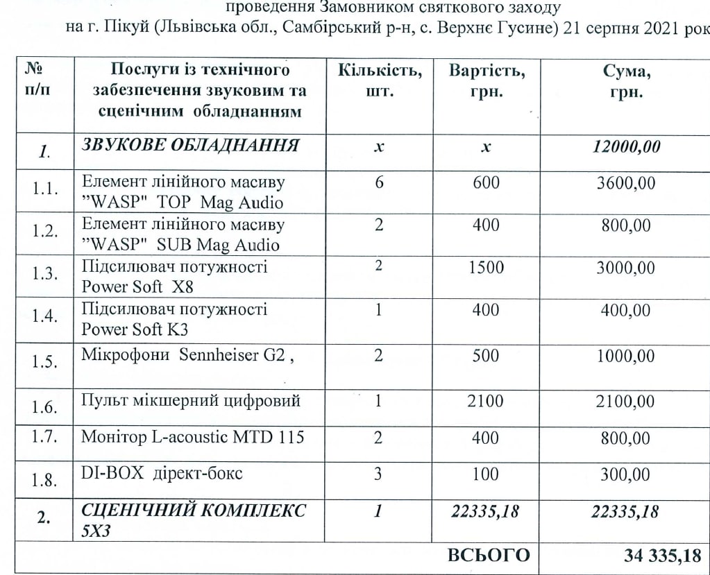 Як інформують «Наші Гроші. Львів», за забезпечення звуковим та сценічним обладнанням під час святкового заходу з обласного бюдету оплатили 34,4 тис. грн. Прокат двох тентів «зірочка» обійшовся у 22,1 тис. грн, а купівля футболок і поло із логотипом (160 штук) у 43,6 тис. грн.